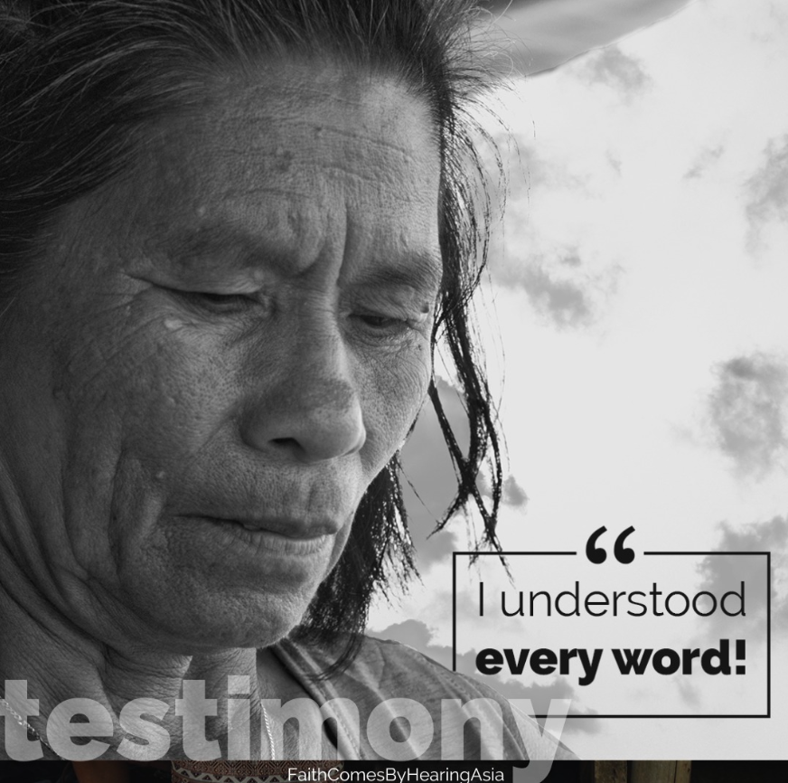 當播放到《約翰福音》第八章時,這位只有四年級教育程度的女士專心聆聽。當她聽到耶穌治癒生來失明的人的故事時,不禁熱淚盈眶,露出了微笑。她喜悅地說:「我聽懂每一句話了!」她甚至能夠用自己的話復述整個故事。